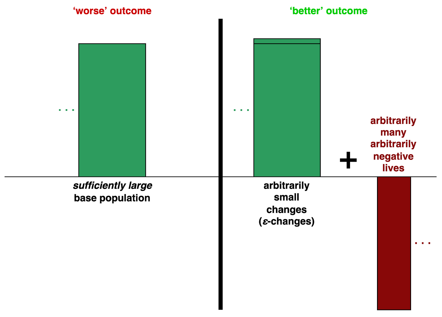 This is the so-called “very repugnant conclusion.” There is also the related implication of “creating hell to please the blissful”: according to total utilitarianism, it would be an improvement to add a population of maximally hellish lives in order to bring a sufficiently large population of almost maximally blissful lives to maximal bliss.